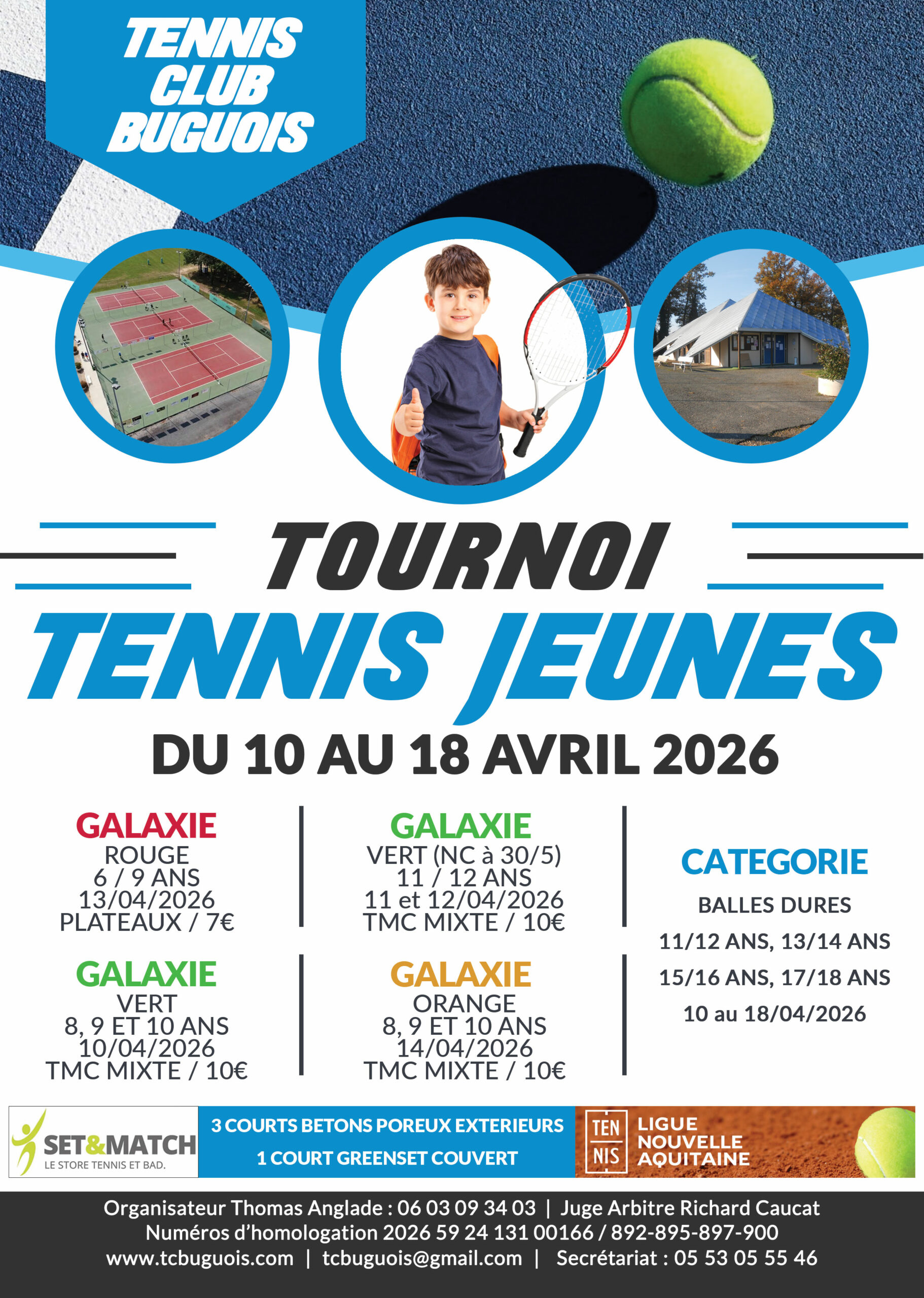 Tournoi jeunes 6 – 17 ans Pendant les vacances de Pâques au Tennis Club Buguois, semaine du 10 au 18 avril, tournoi jeunes à partir de 6 ans : Balles dures de 11 à 18 ans du 10 au 18/04/2026...